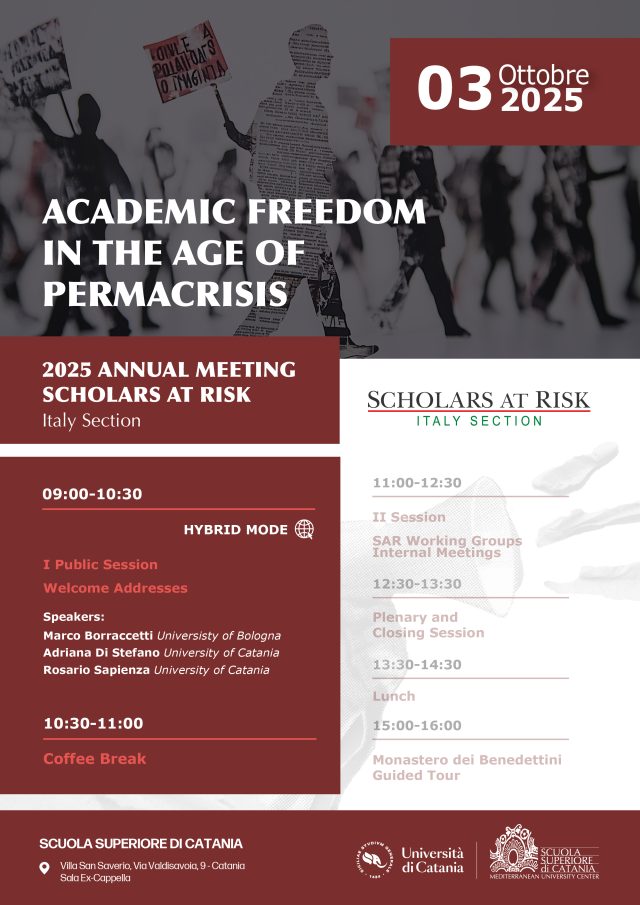 Il 3 ottobre 2025, a partire dalle ore 9:00, si terrà presso la Scuola Superiore dell’Università di Catania l’Assemblea annuale 2025 di Scholars At Risk, Sezione Italia.
