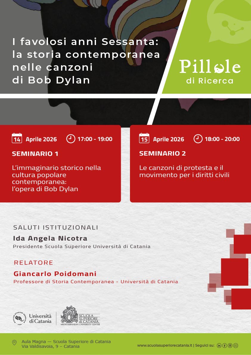 Da Blowing in the Wind a The Times They Are A-Changin’ da Masters of War a Murder Most Foul i versi dylaniani riescono ad illuminare con un fascio di luce poetico e mercuriale momenti ed eventi cruciali della storia contemporanea: l’epopea della Frontiera; il genocidio dei nativi americani; l’America degli hobos e della Depressione; il movimento per i diritti civili e contro il segregazionismo; il pacifismo e la controcultura degli anni ’60-’70; l’assassinio di John Fitzgerald Kennedy; il conflitto in Medioriente; le guerre mondiali. Con le note e i versi di alcune delle sue più iconiche canzoni cercheremo di approfondire la conoscenza dei “favolosi anni ’60”, un decennio che rivoluzionò la letteratura, la musica, la cinematografia e i costumi della società occidentale.