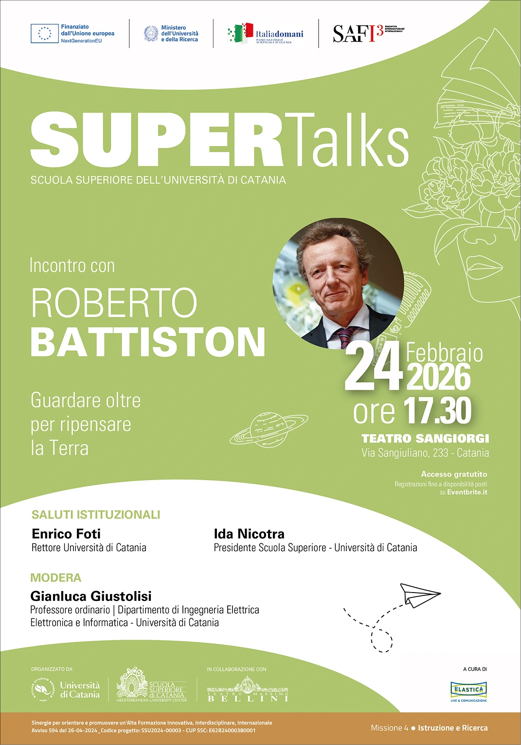 La Scuola Superiore dell’Università di Catania annuncia un nuovo e prestigioso appuntamento con i Supertalks, in programma il 24 febbraio 2026 alle ore 17:30 presso il Teatro Sangiorgi di Catania, che vedrà come protagonista Roberto Battiston, fisico sperimentale di fama internazionale, già Presidente dell’Agenzia Spaziale Italiana (ASI) e protagonista di alcuni dei più importanti progetti scientifici internazionali nel campo della fisica e dell’esplorazione spaziale.